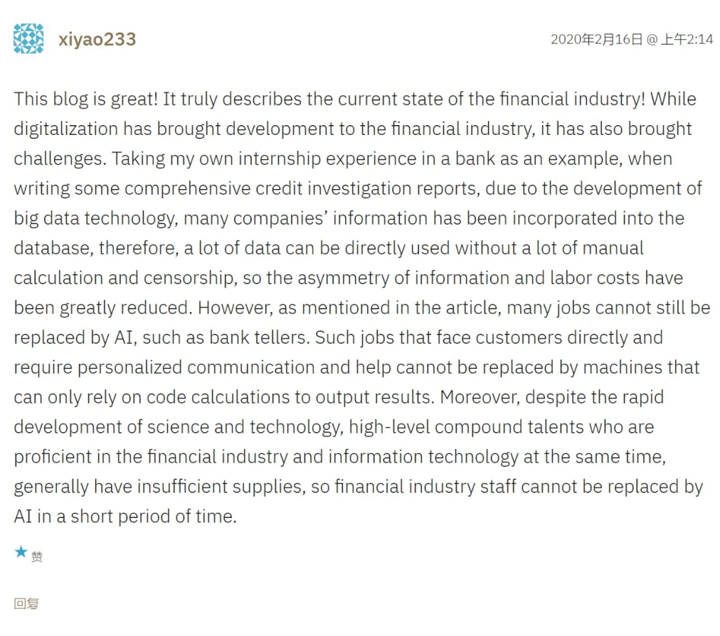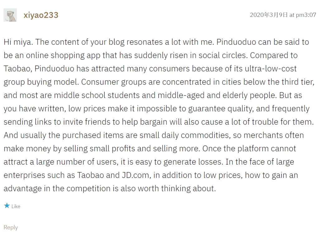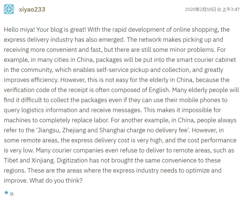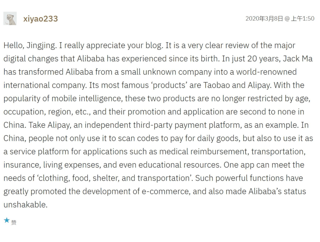 Finally, I have some reflections on blog comments. Below are screenshots of some of my comments on my classmates’ blogs. Through their comments on my blog and responses to my comments, I found that personal opinions are actually limited, and many views are narrow, but through multi-party exchanges, ideas can be broadened and articles can be sublimated and more in-depth.